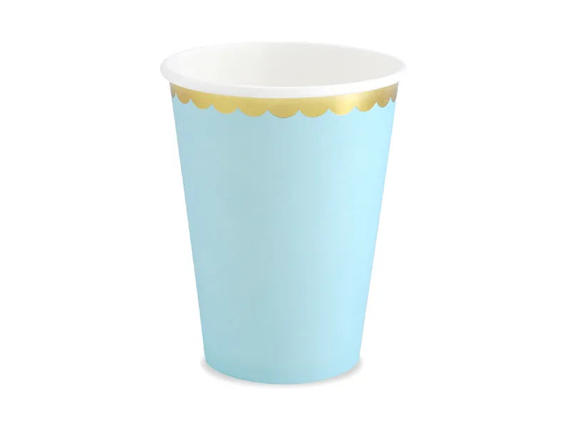 Vasos de cartón color azul claro con bordes metálicos dorados, solo para bebidas frías, capacidad hasta 220 ml (7,4 oz).